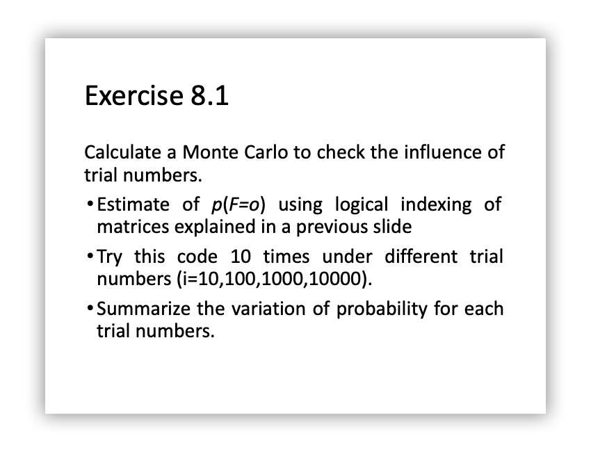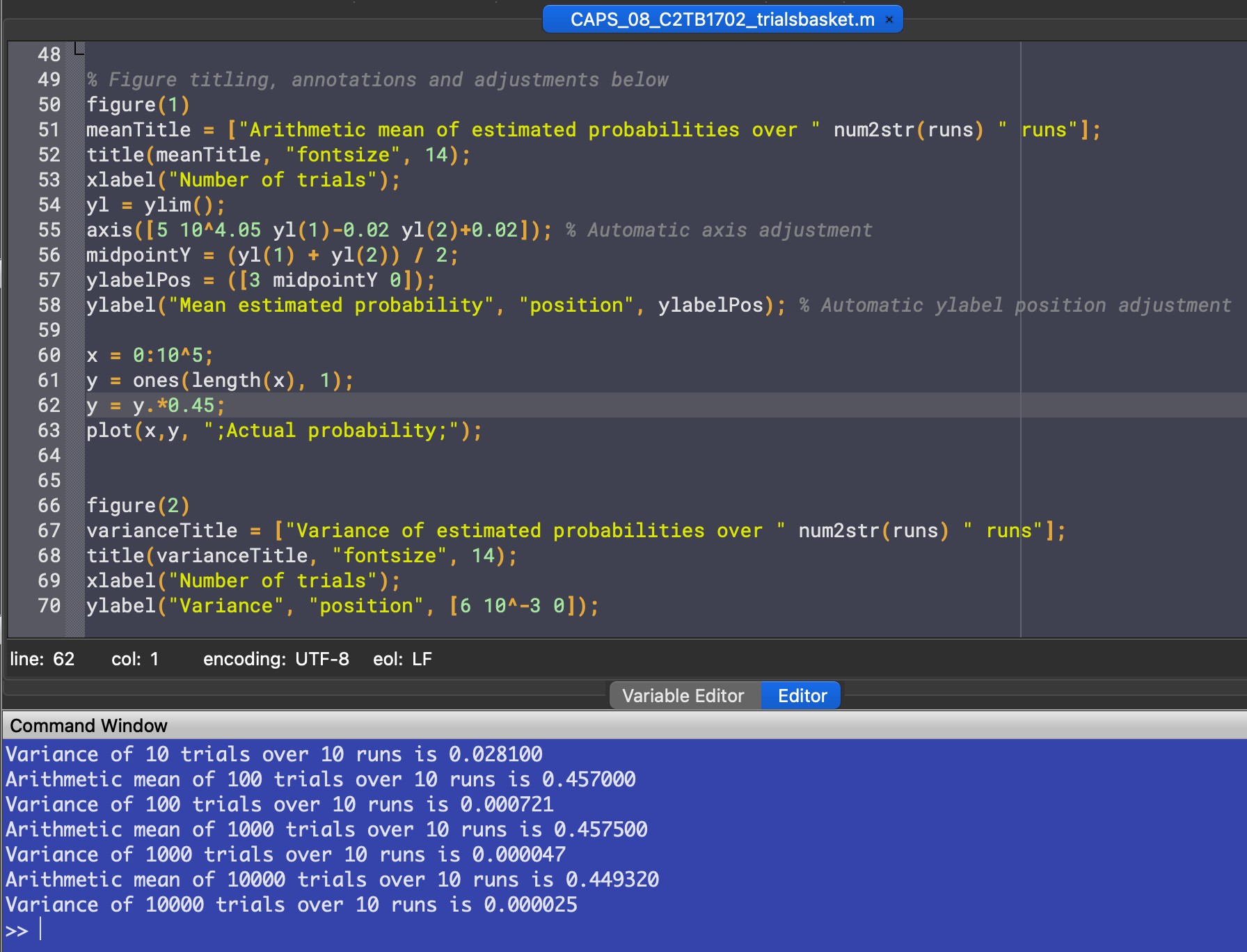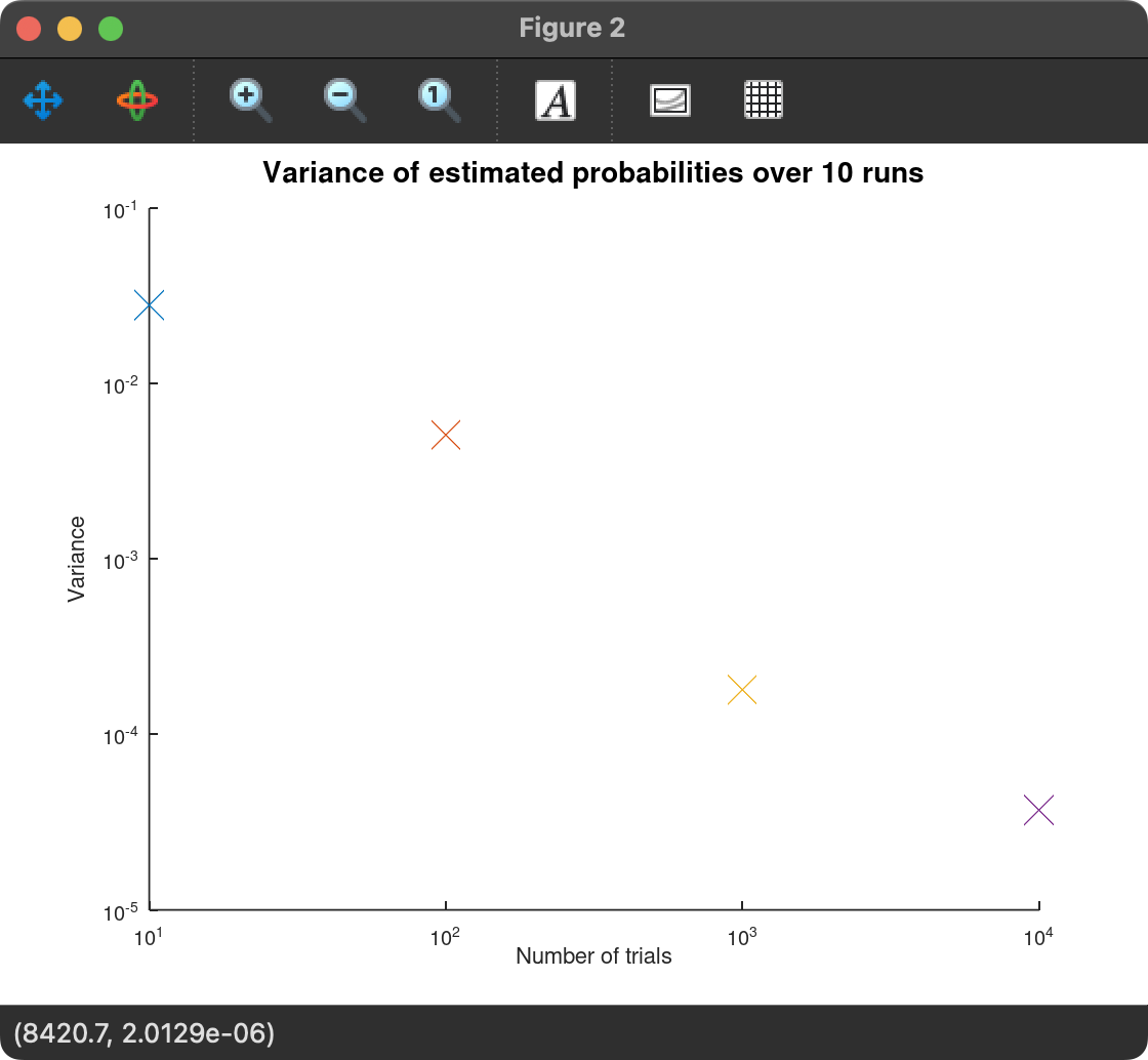 % Variance of the estimated probability over 10 runs variance = varianceNumerator / runs; printf("Variance of %d trials over %d runs is %f\n", trials, runs, variance)