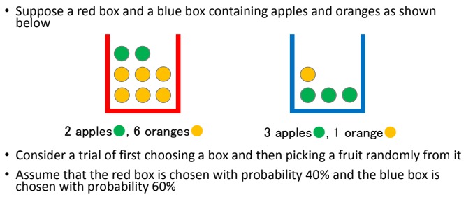 Next, there are 2 apples and 6 oranges with total 8 fruits in box red, and 3 apples and 1 orange with total 4 fruits in box blue. We can denote this by