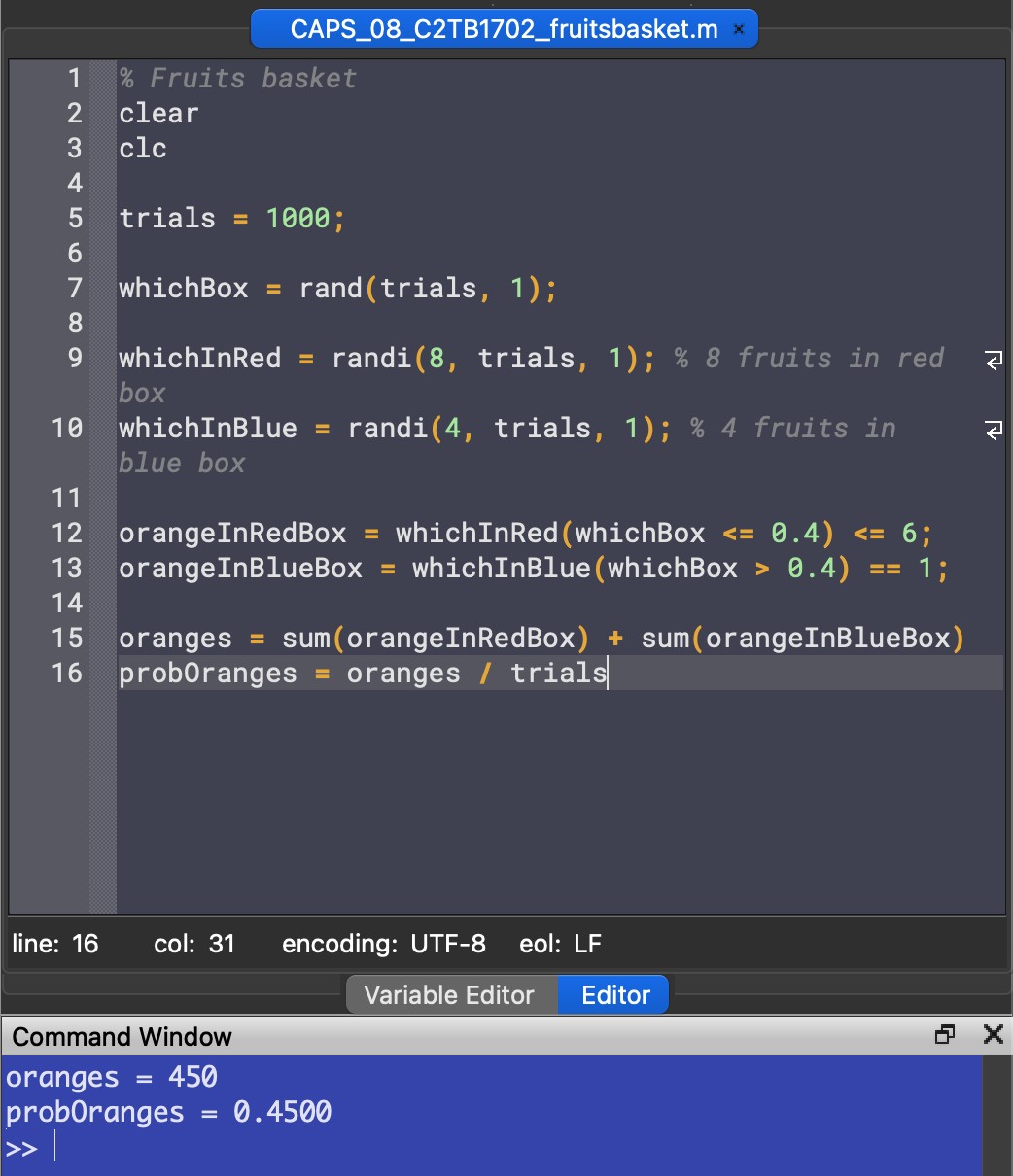 whichInRed = randi(8, trials, 1); % 8 fruits in red box whichInBlue = randi(4, trials, 1); % 4 fruits in blue box