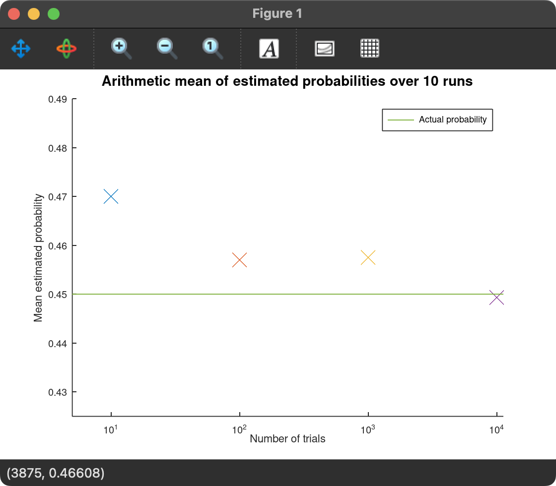 % Mean of the estimated probability over 10 runs meanProb = sum(probOranges) / runs; printf("Arithmetic mean of %d trials over %d runs is %f\n", trials, runs, meanProb)