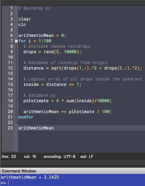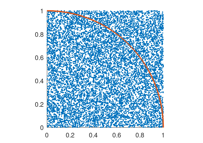 % Initiate random raindrops drops = rand(2, 10000); % Distance of raindrop from origin distance = sqrt(drops(1,:).^2 + drops(2,:).^2); % Logical array of all drops inside the quadrant inside = distance <= 1; % Estimate pi pi = 4 * sum(inside)/10000